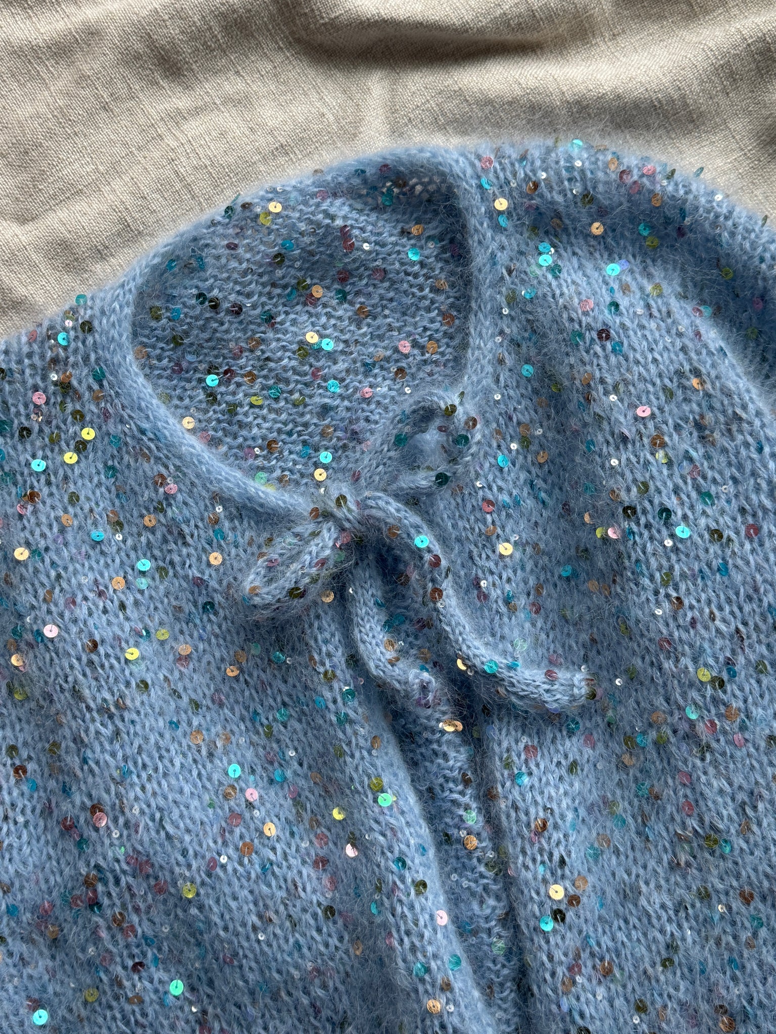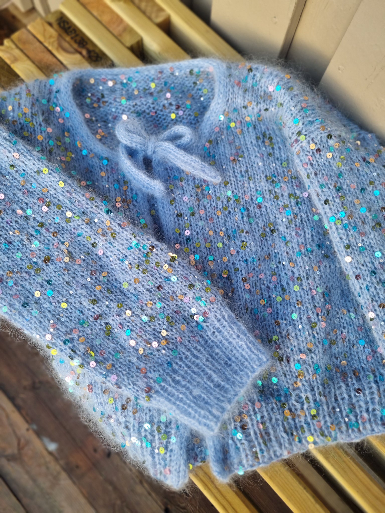 Materialer: 200 (200) 200 (225) 225 (250) 250 gram Bella fra By Permin (50 g = 145 m) sammen med 200 (200) 200 (200) 200 (400) 400 gram Paillettengarn fra Wolle Halle (200 g = 520 m)